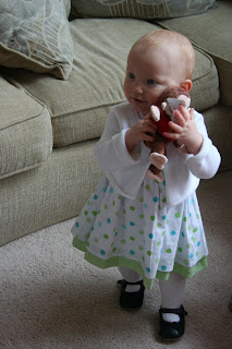 Karissa is One today! Where has the last year gone. I can't help but think about what was happening last year at this time. She has grown and changed so much in the last year. She is no longer a baby, she is a little girl with a very strong personality. She is an amazing little girl and I just love so very much! What is Karissa doing these days? She is running all over the house. She no longer crawls at all. She learned how to stand back up with out haning onto anything when she falls. She laughs and smiles all the time. She chases after Buddie, he's not so sure about her sometimes. She says mama, dada, papa, nana, by, buuu (buddie), and num num. She points and grunts to what she wants. She eats 3 meals a day with a couple of snacks. She takes one good afternoon nap and sometimes (like today, turning one is hard work!) she take a morning nap. She sleeps from 8:30-9:30 pm to 8-9 am. She wears 12 months clothes and sleepers, size 5 shoes (yes she has big feet!), and size 3 diapers. She has 10 teeth as of this week when 2 top molars popped in. Her hair is growing in nicely and is definitely red (people are starting to notice that!). RJ says poor baby has my hairline! I'm hoping by the time she is 2 I can do piggies in her hair! i don't know how much she weighs yet because her appt isn't for another couple of weeks. Well I could keep going on and on and on about my little lady but I will stop boring you all. I hope you have enjoyed looking at my little lady grow over the last year as much as we have!
